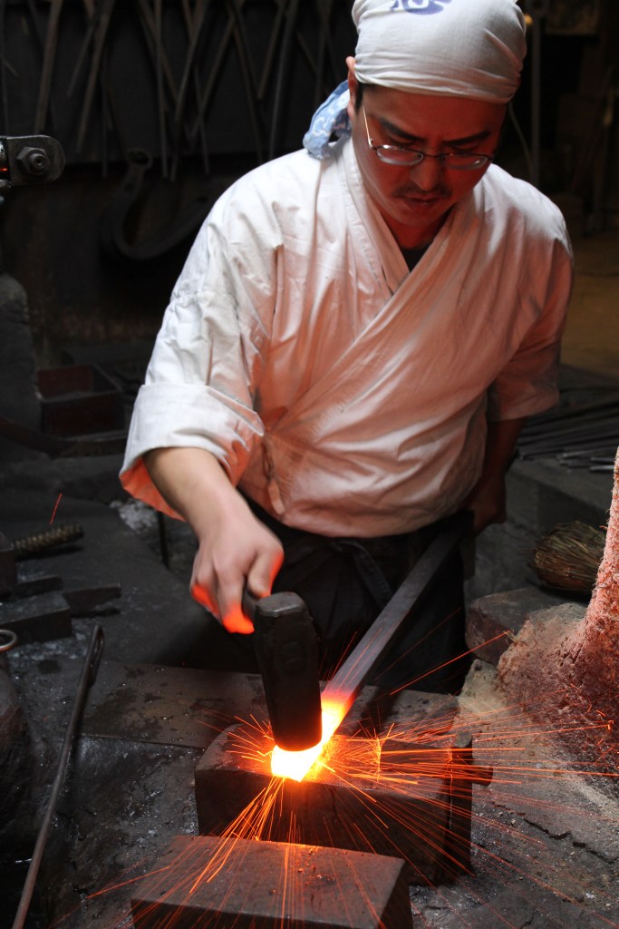 Japanese family businesses place greater importance on talents and abilities over bloodlines. It is not uncommon for a talented non-descendant to join a family in order to carry on the family mon (crest). And talented Jun Mizuno (水野淳) is! In his 40s and behind a pair of glasses, Jun Mizuno (a.k.a. Noritada Mizuno 水野範忠) still looks like the handsome theatre actor he once was. But when standing in front of that pine charcoal powered forge, there is no doubt that he’s became a master in blacksmithing. His superior craftsmanship and extraordinary honyaki katana works have been recognised by two of Japan’s top Ichinomiyas (shrines) which have commissioned his katanas to become the shrines’ permanent collections — an extraordinary accolade and recognition for a blacksmith of his age.